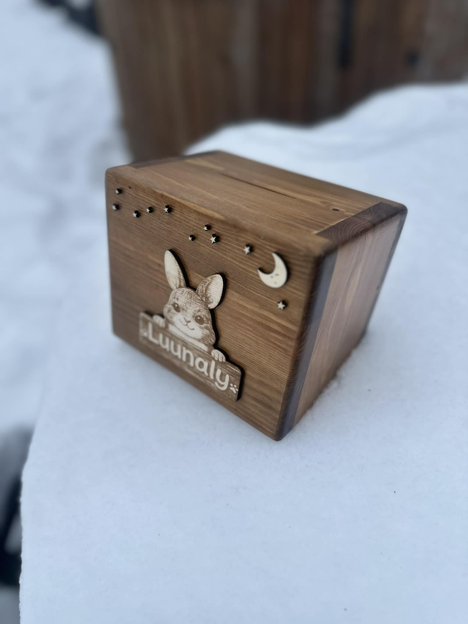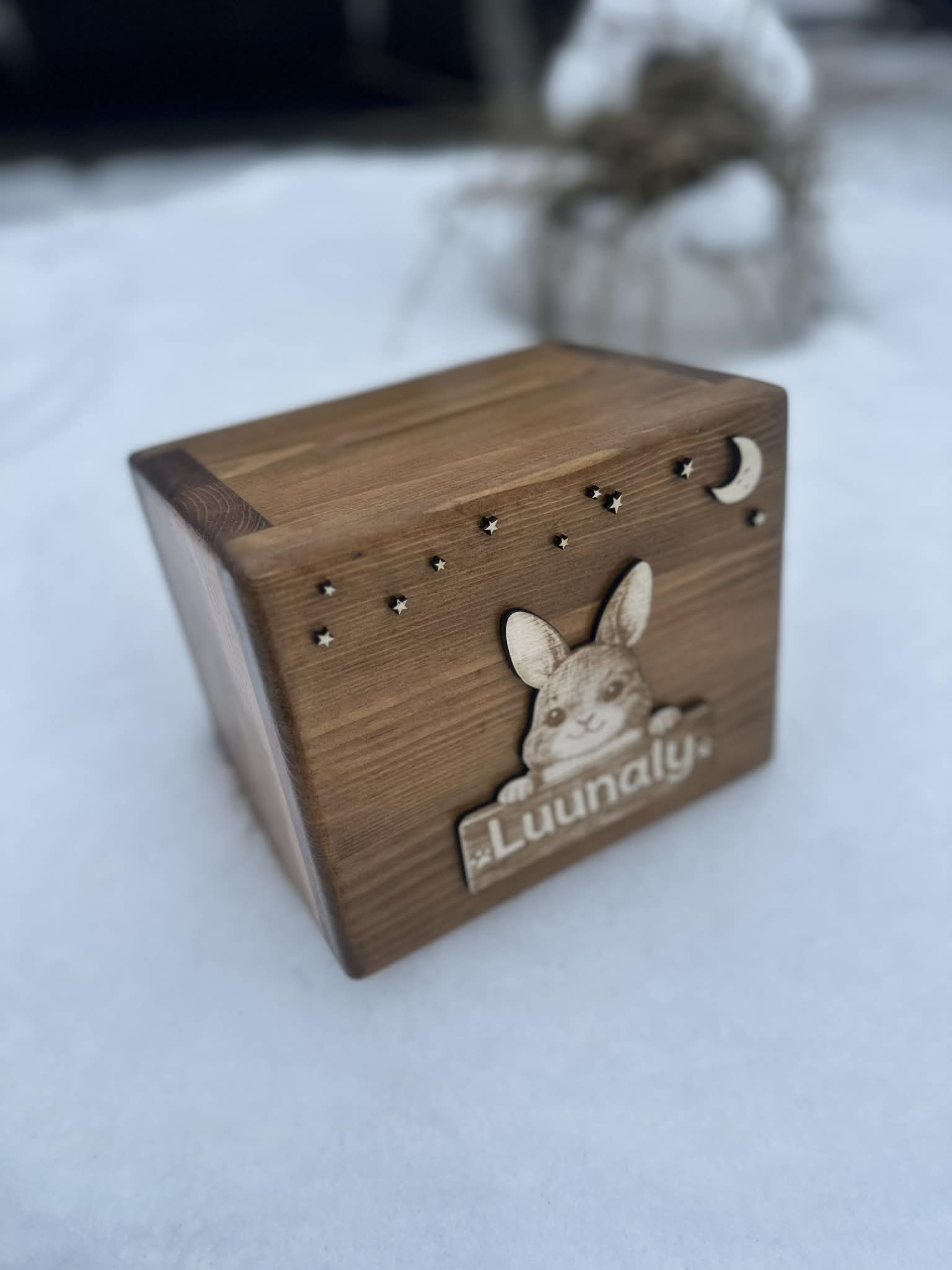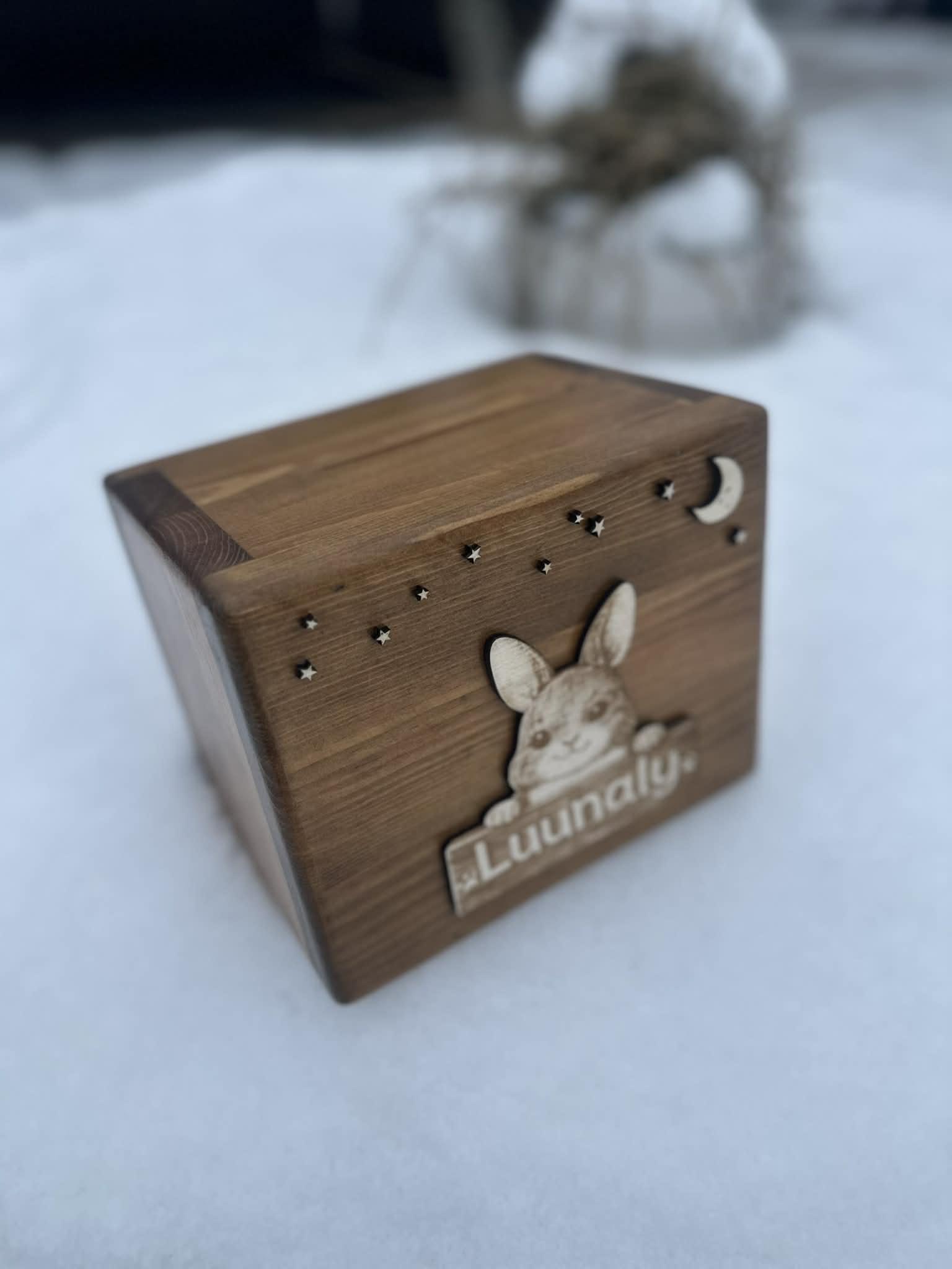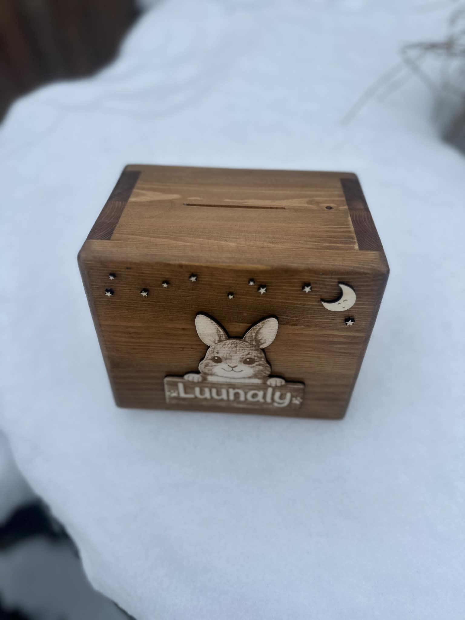 “Ööjänku Hoiupank” on käsitööna valminud puidust rahakassa, mis hoiab sinu väikese (või suure) unistaja säästud turvaliselt kuu ja tähtede all. Pehme jänku piilub eest – kontrollib, kas sa ikka kogud… või käid salaja šokolaadiraha kallal.