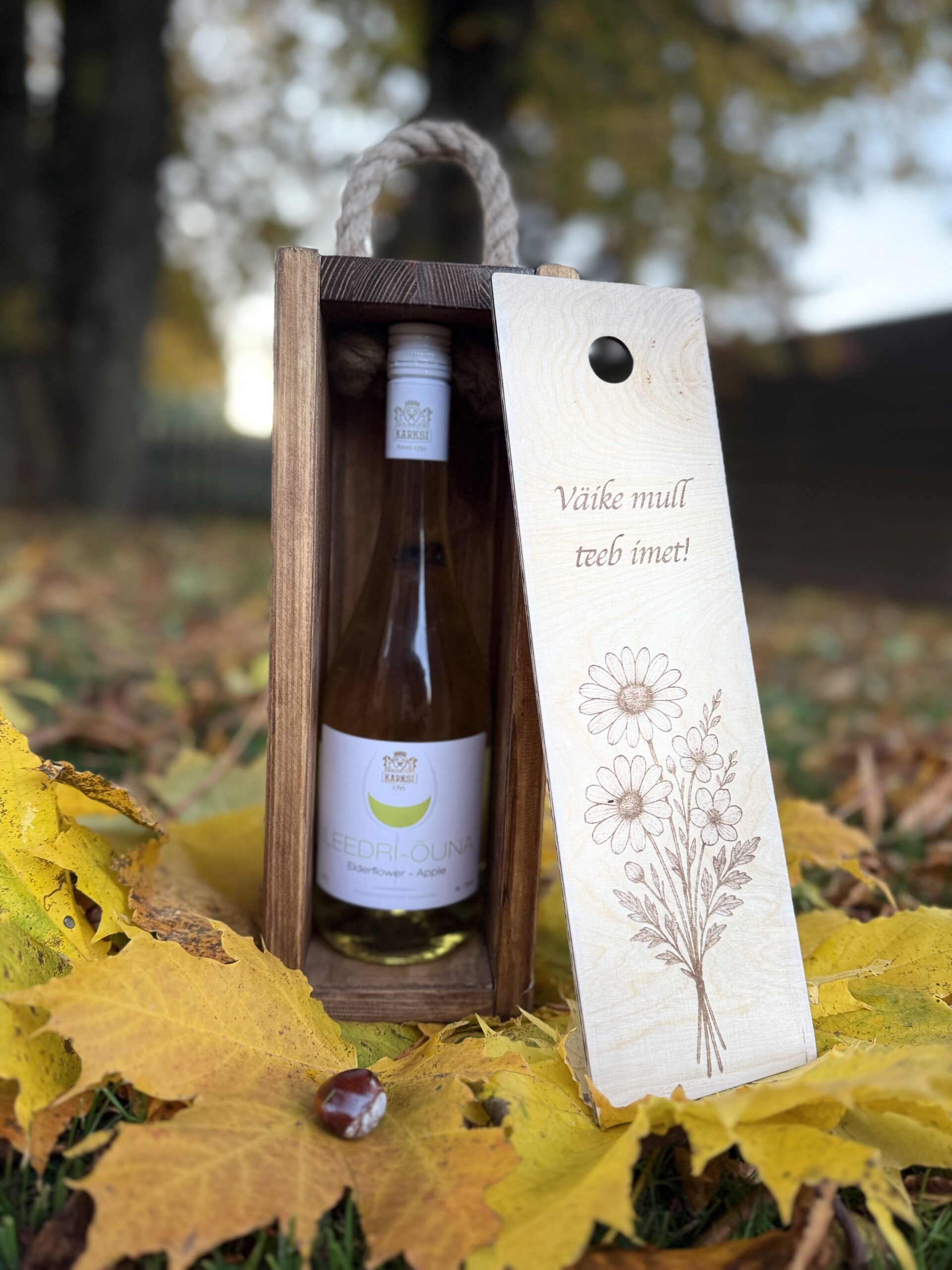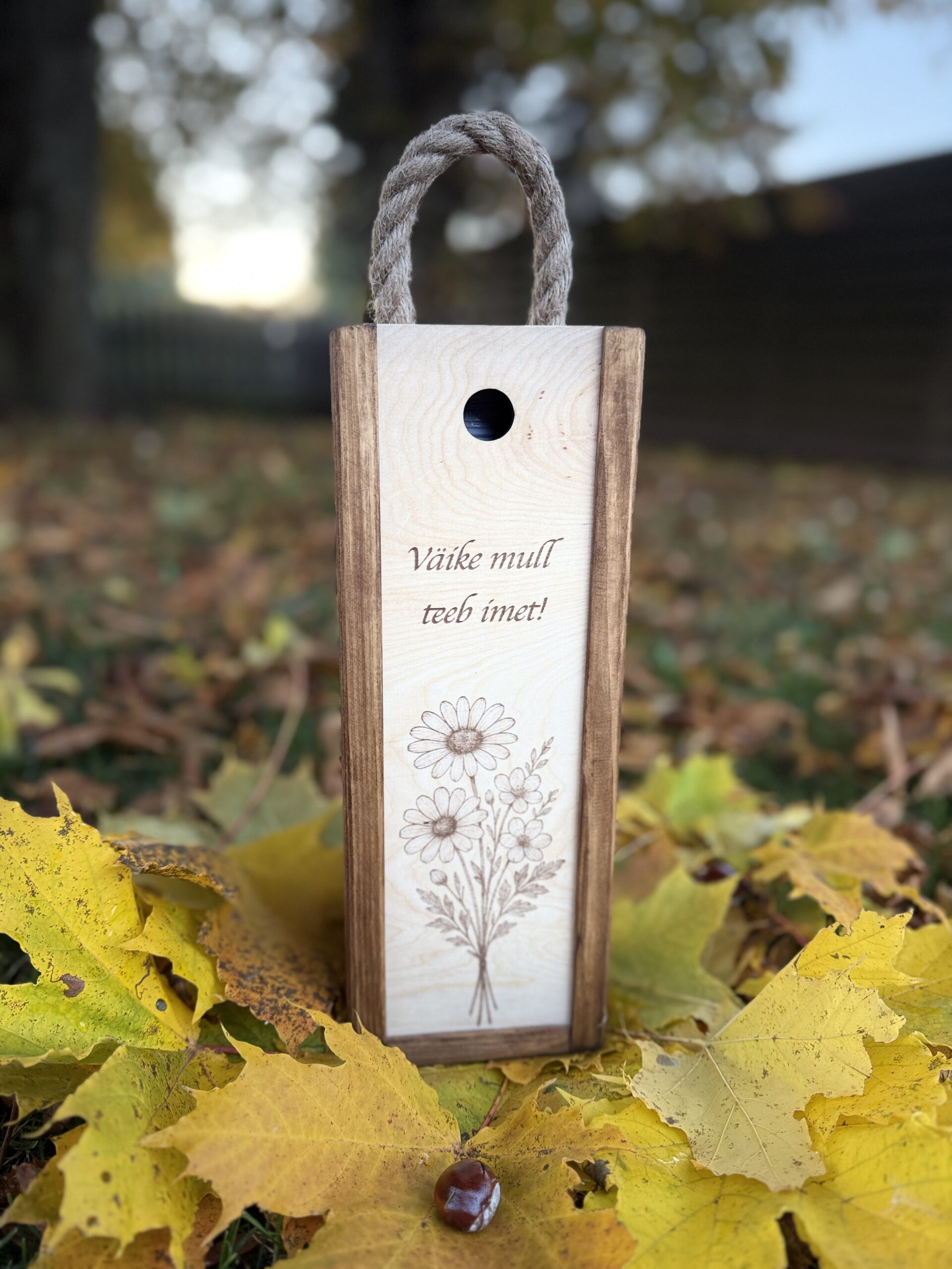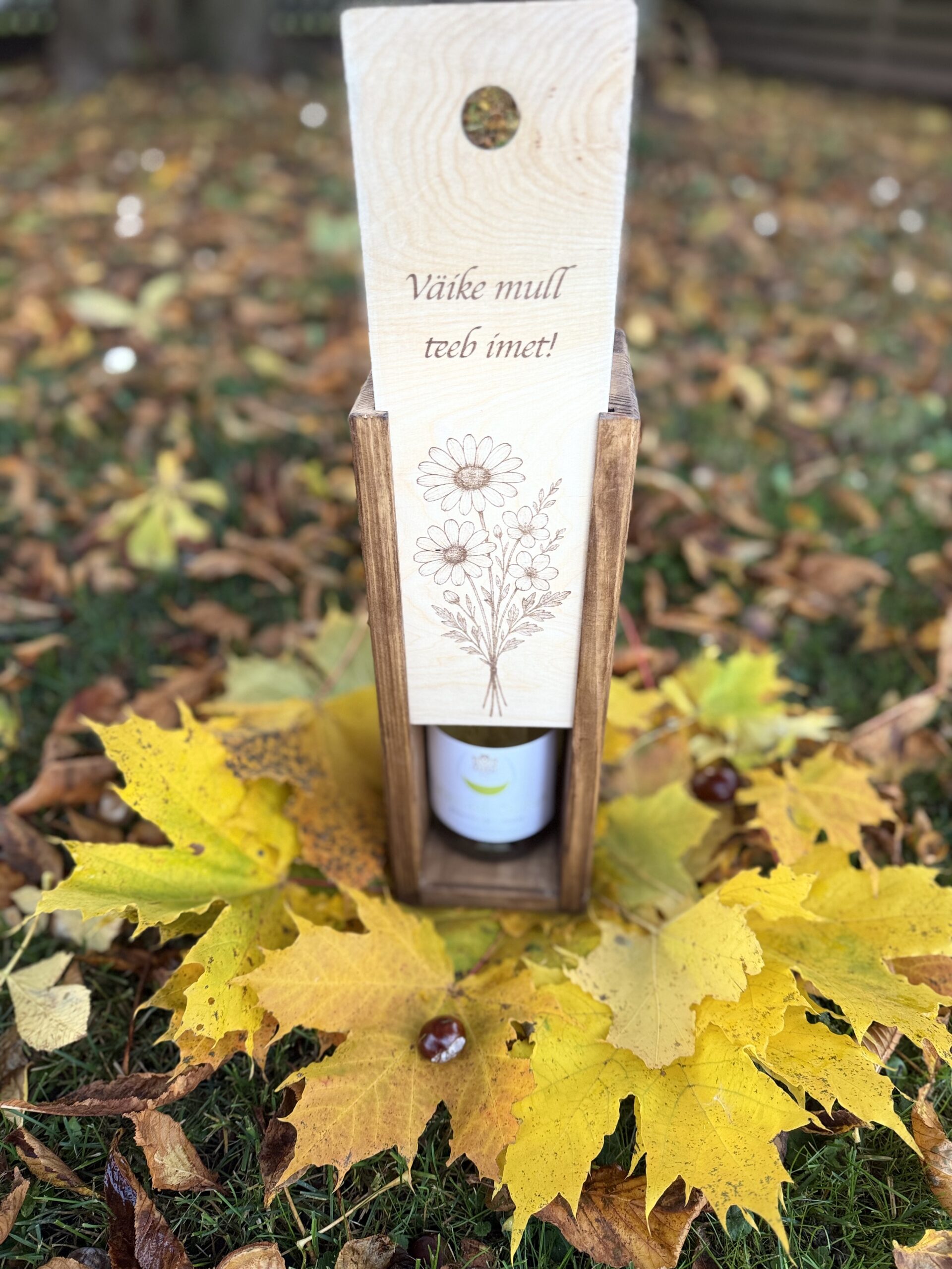 Elegantne ja samas maalähedane puidust kinkekarp, mis on loodud väärikalt presenteerima sinu lemmikpudelit. Iga karp on käsitööna valmistatud, töödeldud naturaalse puidutooniga ning kaunistatud graveeritud sõnumiga.