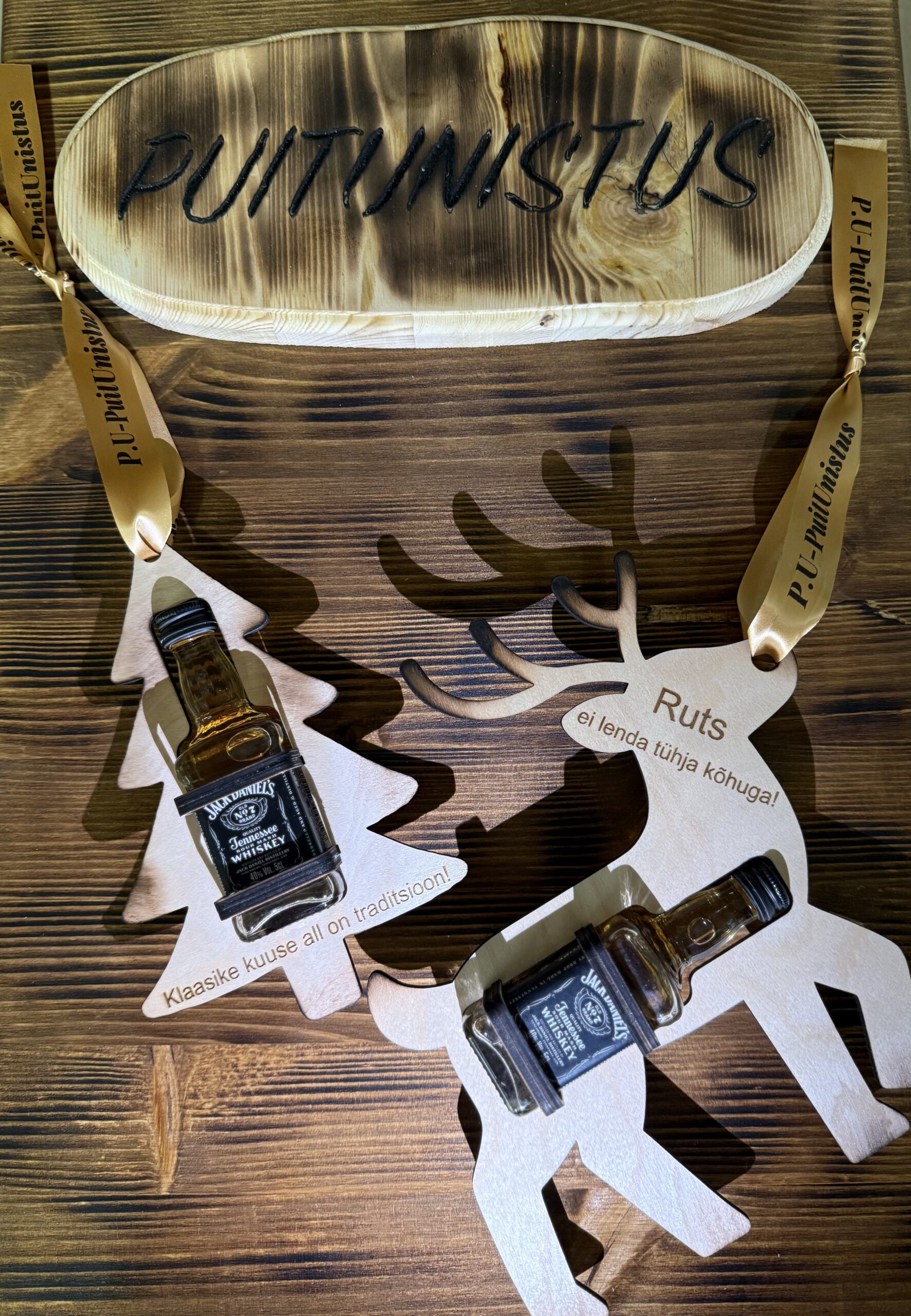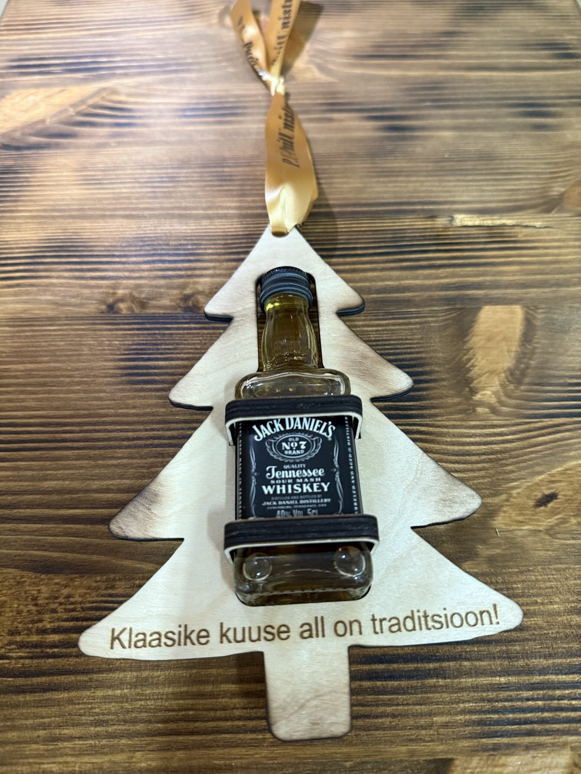Puidust ehted, mille külge on kinnitatud väike pudelike jõulurõõmu – olgu see viski, glögi või mõni muu hinge soojendav naps. Need ehted toovad kuusele sära ja sulle naeratuse – või vähemalt kergelt punased põsed. Ideaalne kingitus sõbrale, kolleegile või iseendale, sest ausalt… keegi peab ju ka kuuske valvama.