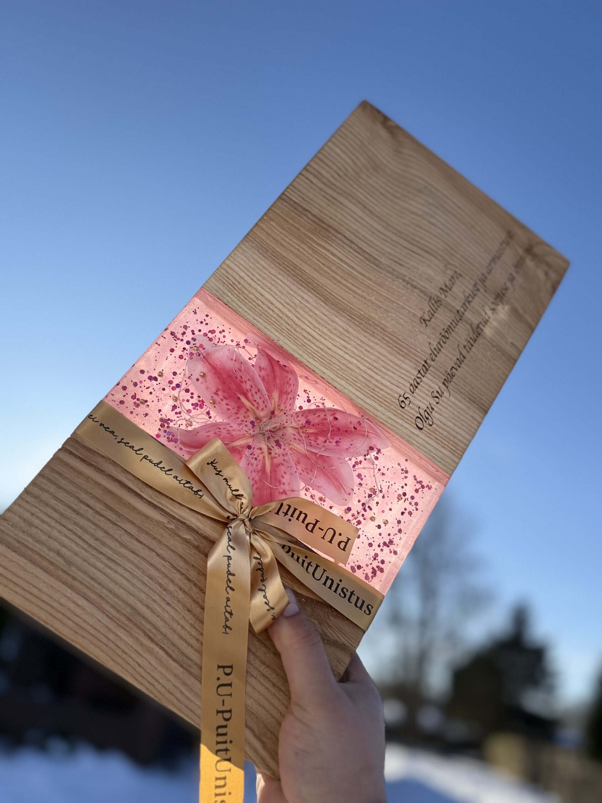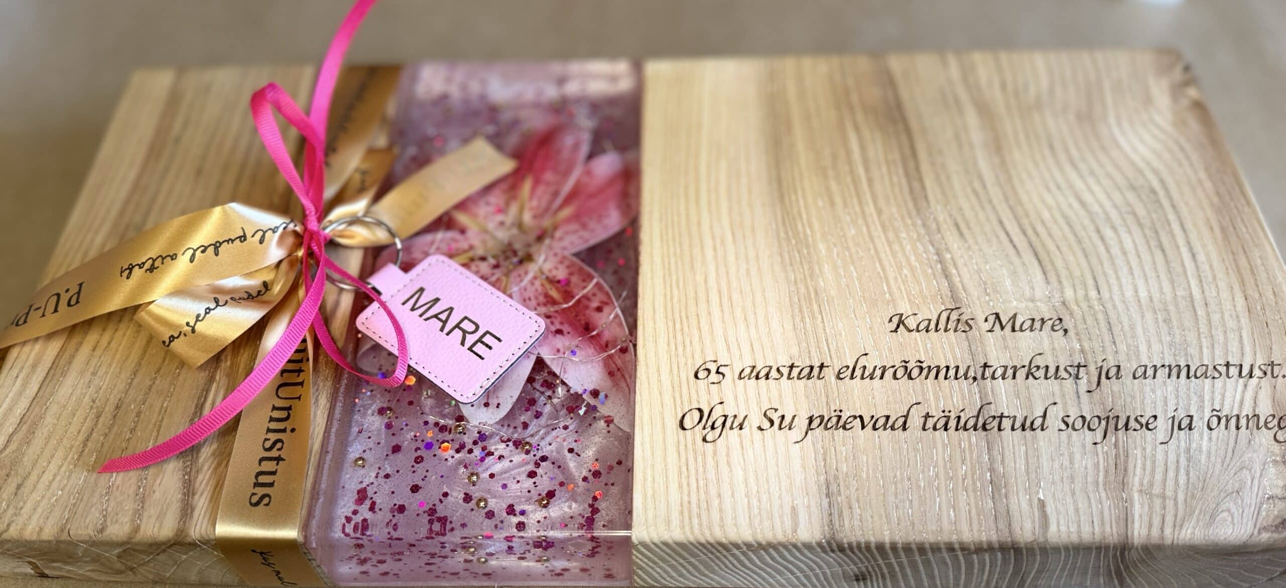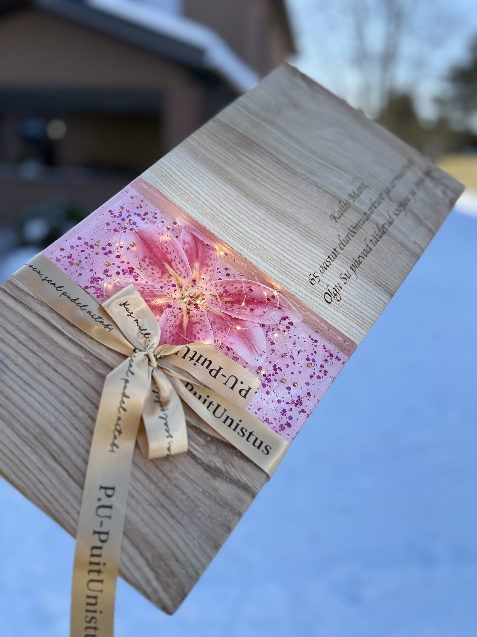 Meie käsitööna valminud puidust serveerimisalus ühendab naturaalse puidu, kunstilise disaini ja peidetud LED-valguse, et luua efekt, mis paneb nii külalised kui koogi särama.